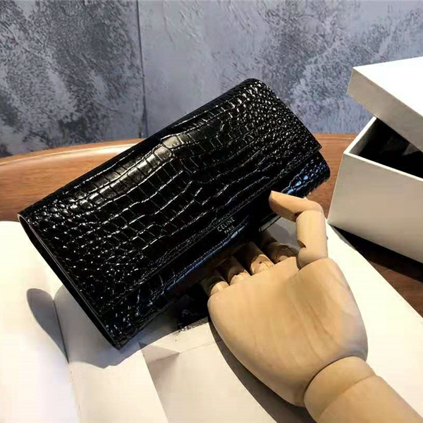 Celine錢包 鱷魚紋 小牛皮 大號 Celine翻蓋長款錢包 黑色