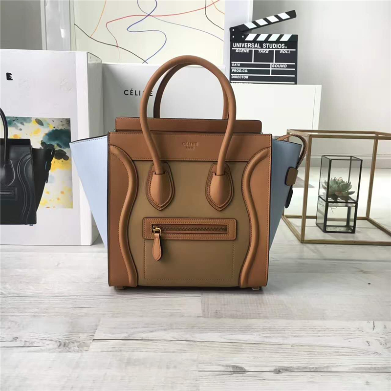 2017賽琳 celine笑臉包囧臉包 頭層牛皮 三色拼接 翅膀手提包 駝色黃棕天蘭