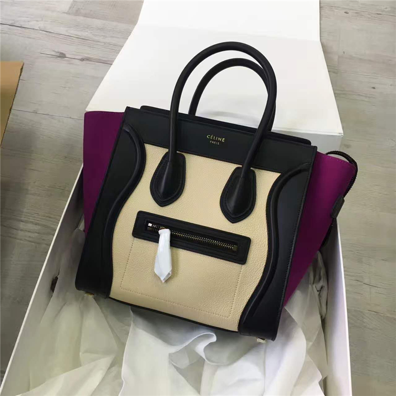 - 2017賽琳 celine笑臉包囧臉包 頭層牛皮 三色拼接 翅膀手提包 奶油黃黑磨砂紫