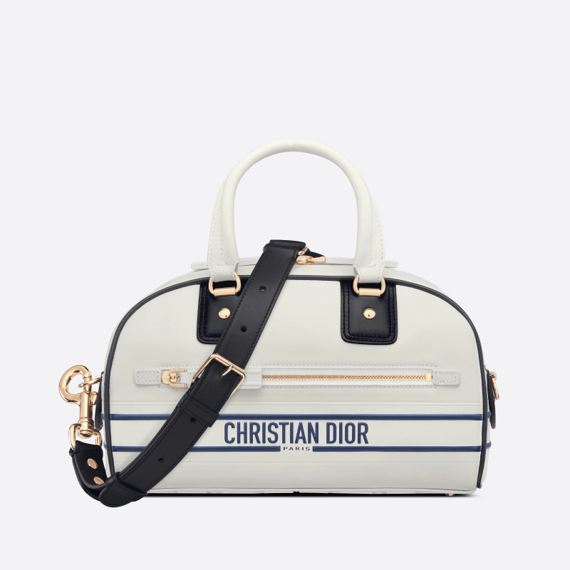 • 詳細介紹:這款 Dior Vibe Bowling 拉鏈手袋由瑪麗亞·嘉茜婭·蔻麗 (Maria Grazia Chiuri) 設計,采用白色和藍色光滑牛皮革精心制作,將運動風格經典標識與 Dior 的高訂精神巧妙融合!癈HRISTIAN DIOR PARIS”標志突顯正面拉鏈口袋,同色調橡膠底面飾以從 Dior 運動鞋汲取靈感的星星圖案。小號款式,可與 Dior Vibe 運動鞋搭配,打造精致造型。