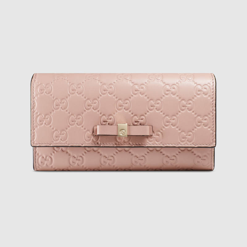 388679 Gucci Signature系列 熱壓皮革 蝴蝶結 長款皮夾 淺粉色