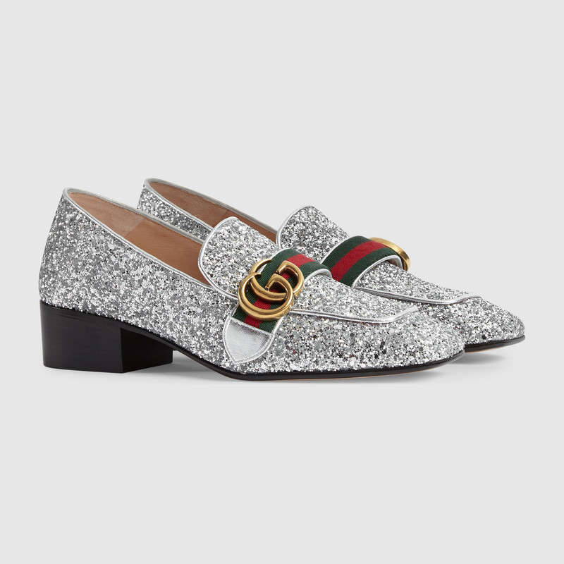 • 結構:銀色閃光面料,配以綠/紅織帶,雙G裝飾,鞋跟35毫米