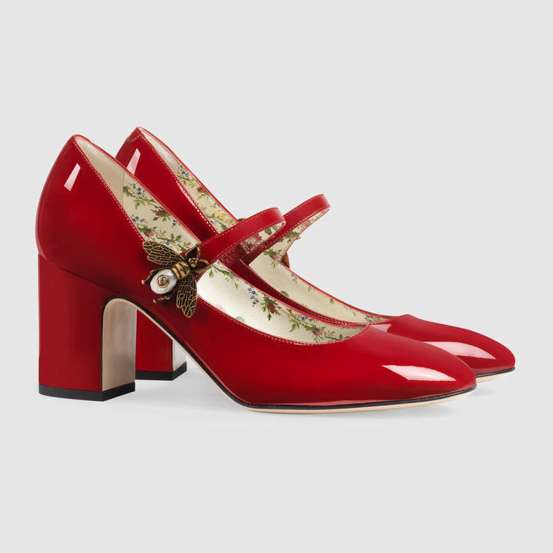 481177 GUCCI 蜜蜂裝飾 漆皮 中跟鞋 芙蓉紅