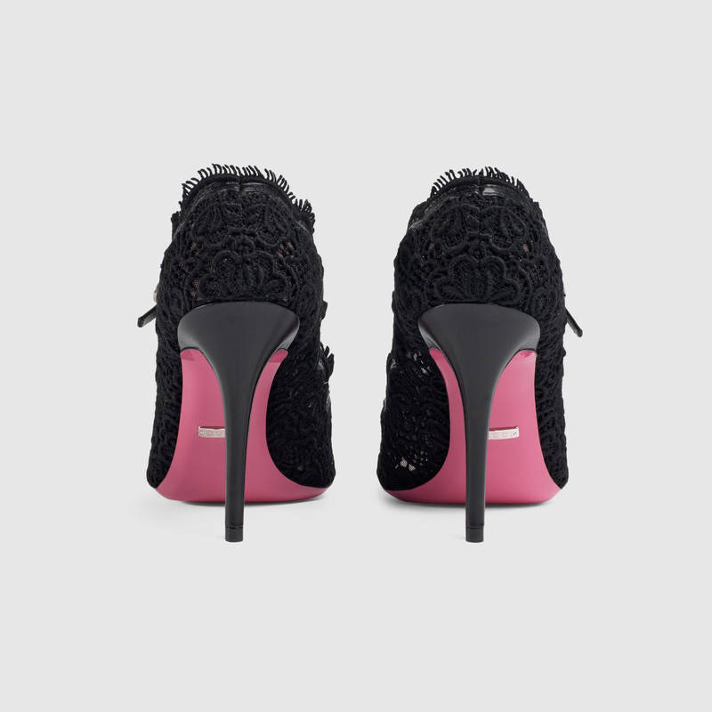 • 488328 GUCCI 2017款 透明花卉蕾絲 水晶帶扣 尖頭高跟鞋 黑色