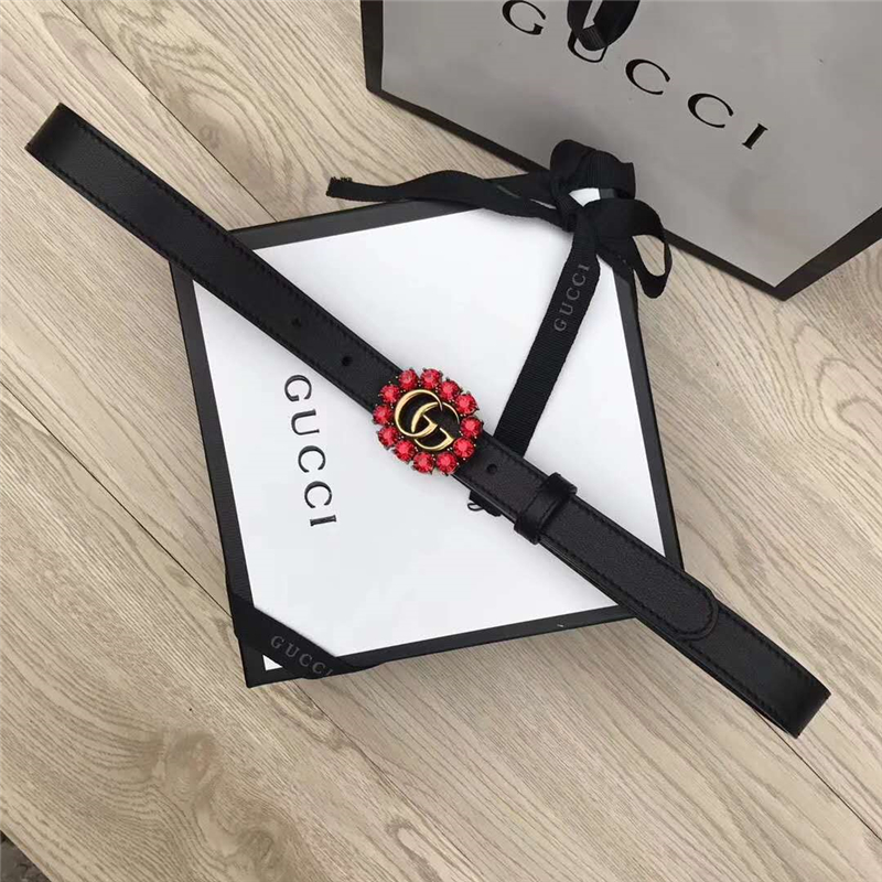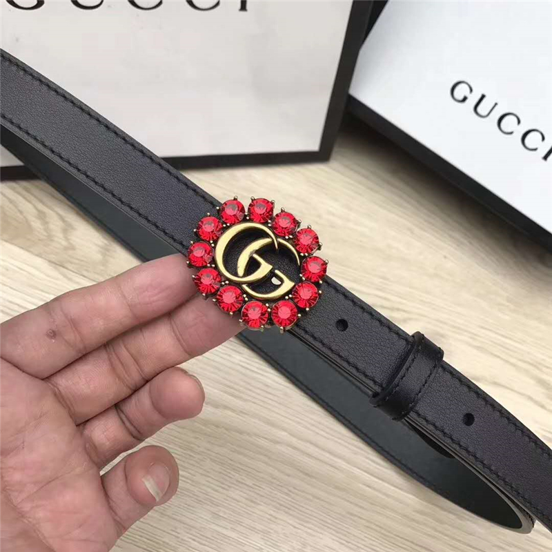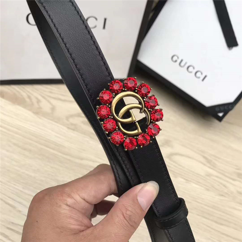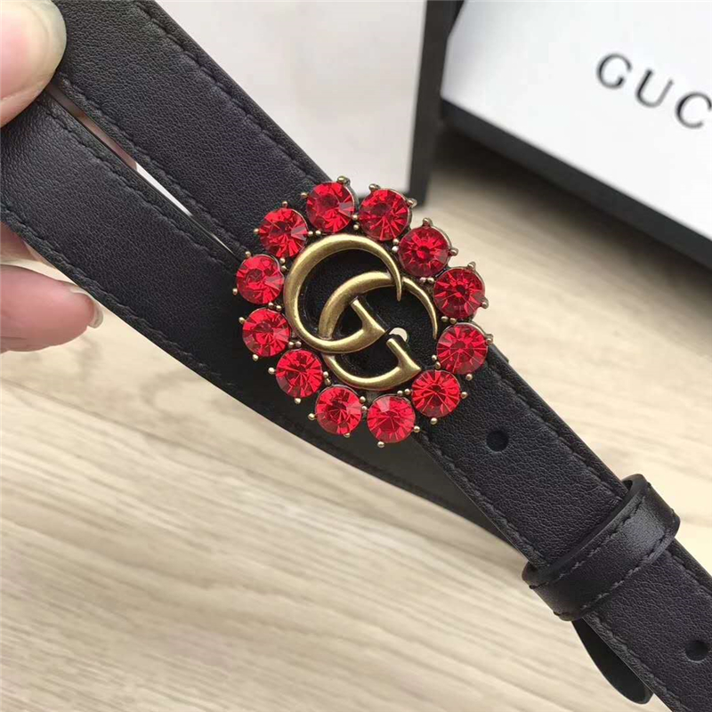 • Gucci 模特走秀款 紅色水晶 雙G帶扣 皮革腰帶 黑色