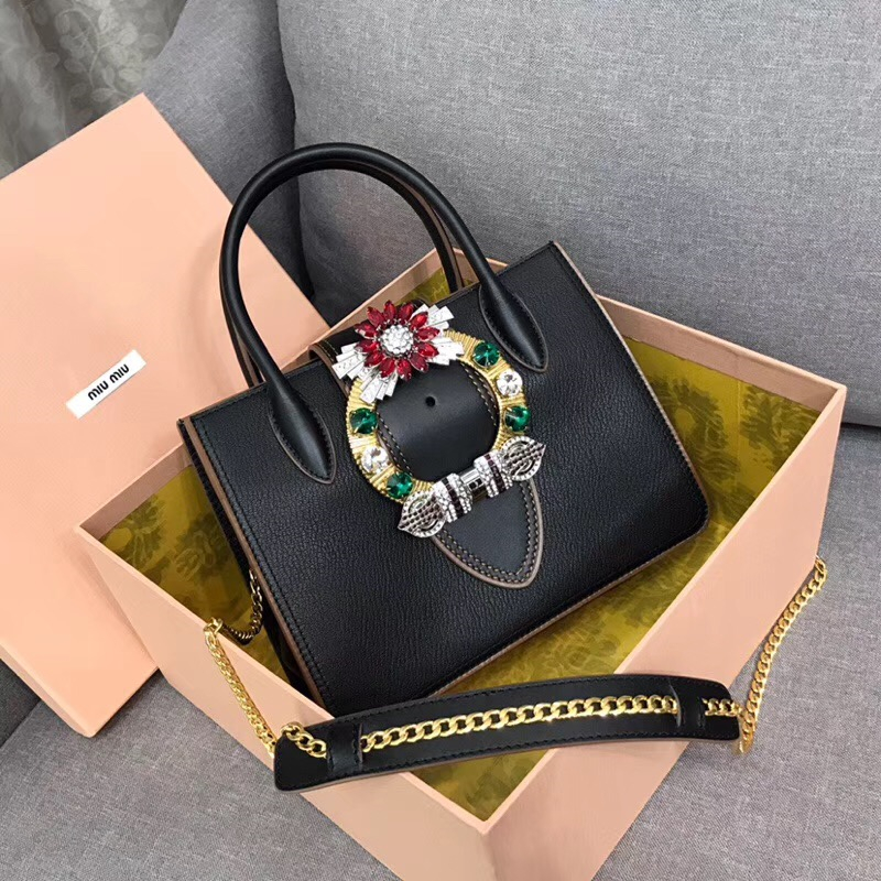 • 5BA043B MiuMiu女包 繆繆手提包 寶石鉆扣 牛皮山羊紋 半蓋頭手袋 黑色