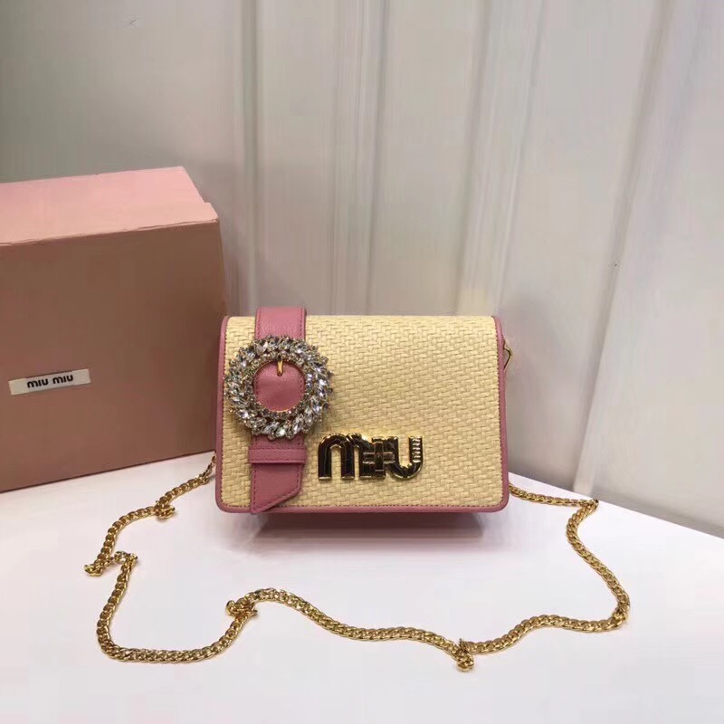 5BF068 MIUMIU專柜新款 草編皮革 仿水晶帶扣 轉鎖翻蓋 肩包 紫紅色