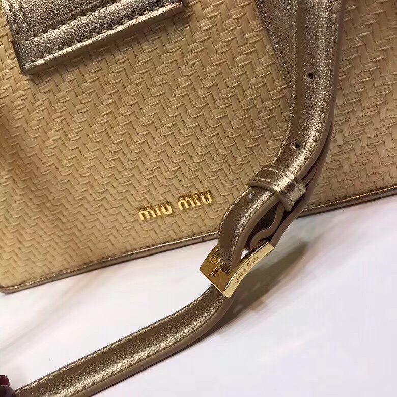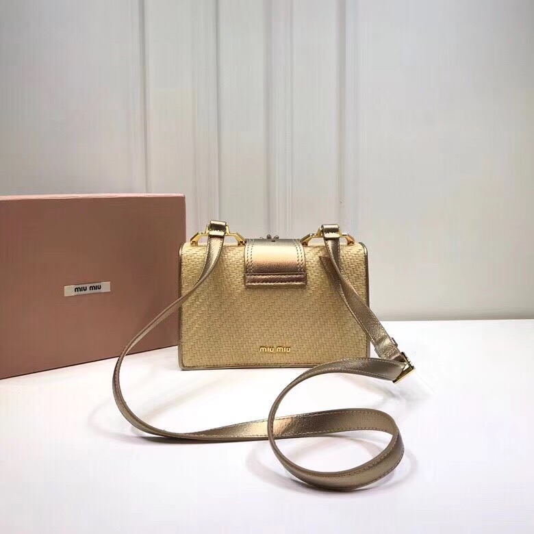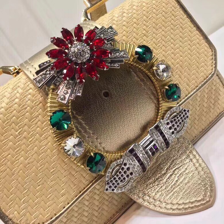5BH609 MIUMIU專柜新款 仿水晶帶扣 草編皮革 翻蓋手袋 金色