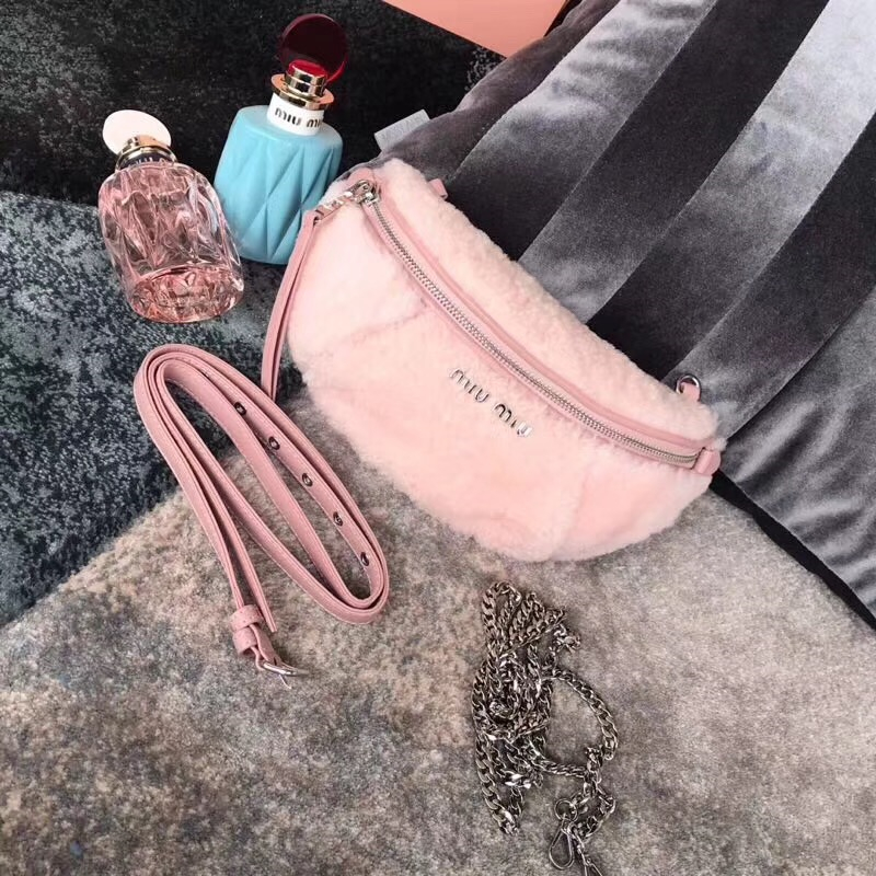 5BL010 MiuMiu女包 繆繆腰包挎包 羊羔毛手袋 小羊皮腰包 粉色