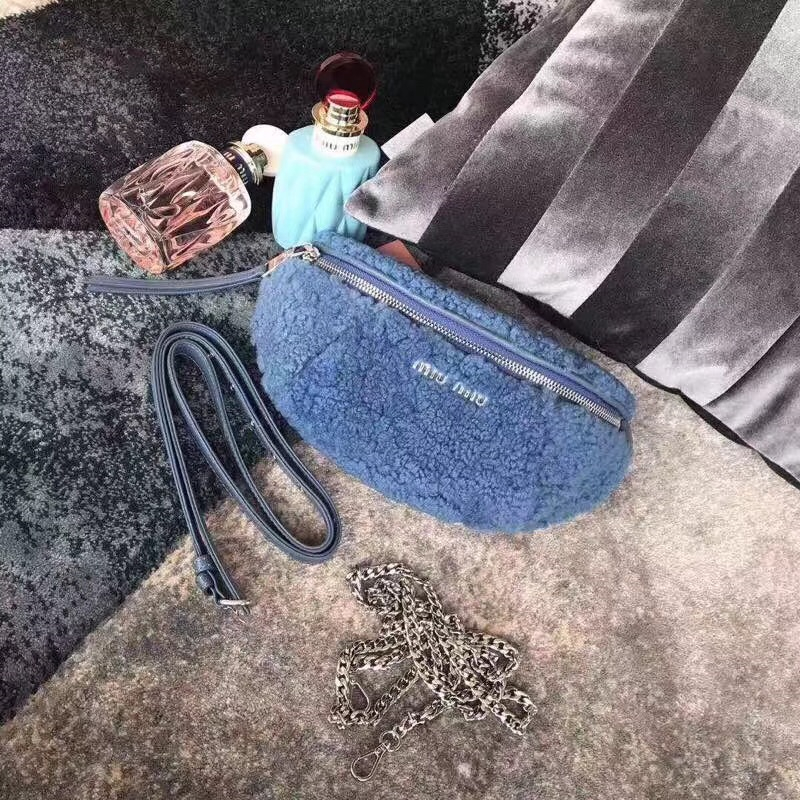 5BL010 MiuMiu女包 繆繆腰包挎包 羊羔毛手袋 小羊皮腰包 藍(lán)色
