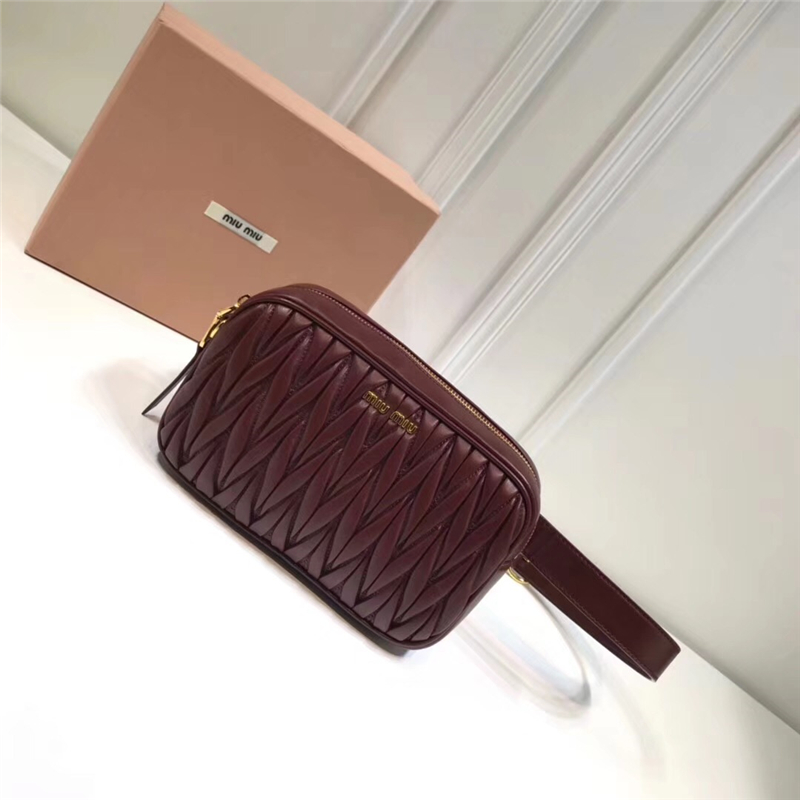 5BL018 MIUMIU繆繆 軟羊皮 經典褶皺 拉鏈 皮腰包 棗紅色
