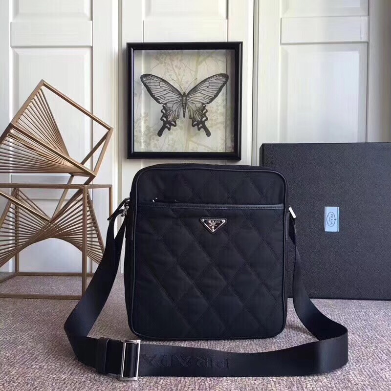2VH002 Prada普拉達 繡格仔 降落傘布 男士郵差包 黑色
