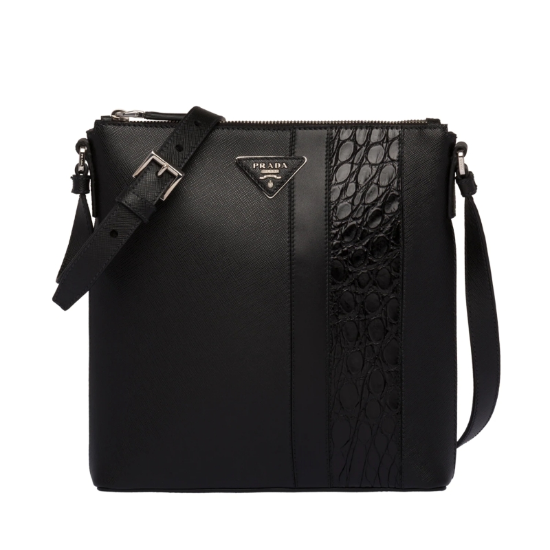 • 結構:Saffiano皮革材質鱷魚紋飾邊金屬配件可調式皮革肩帶主隔層配拉鏈包身內部拉鏈袋Prada徽標襯里內部徽標銘牌正面外部三角形徽標