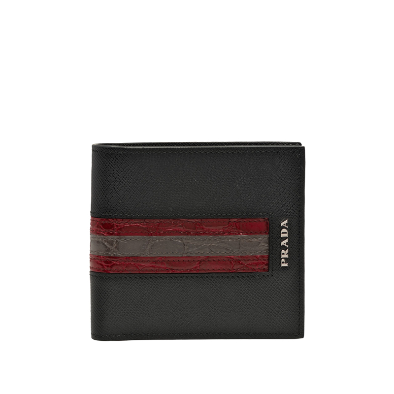 2MO513 Prada普拉達 Saffiano配鱷魚皮 雙折短錢夾 棗紅拼灰