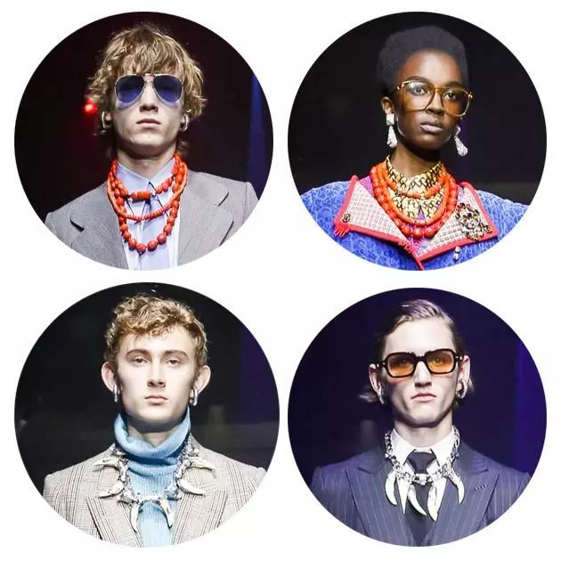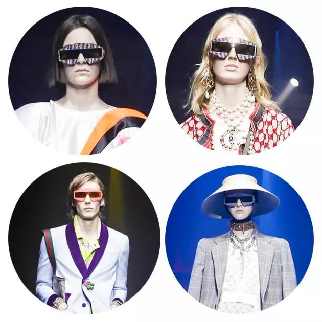 在配飾方面,這一季的Gucci推出了復(fù)古的長(zhǎng)方形墨鏡,加上bling bling夸張的裝飾,十分搶鏡。