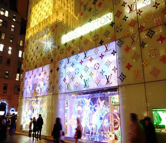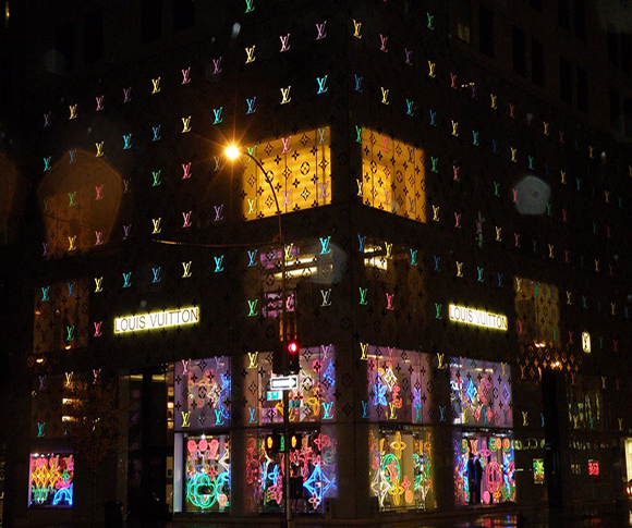 LV門店也曾為了這個風(fēng)格而改頭換面,比如把繽紛的Monogram印在了門店的外墻。