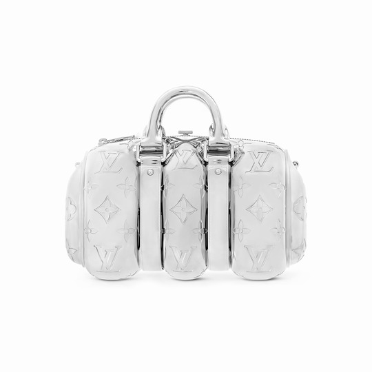 Keepall Clutch Blown Up 手拎包采用銀色金屬打造,通過18小時塑形成「充氣」風(fēng)格,鏡面拋光營造出閃耀光影,再耗時4小時制作內(nèi)襯等細節(jié),極具創(chuàng)意;Crushed 軟箱包采用銀色牛皮制作,內(nèi)層設(shè)置鋁質(zhì)薄片,可擠壓和塑造成不同形狀;Monceau Dstorted 手袋亮點是斜向包頂結(jié)構(gòu),鎖扣和手柄界采用離軸設(shè)計。