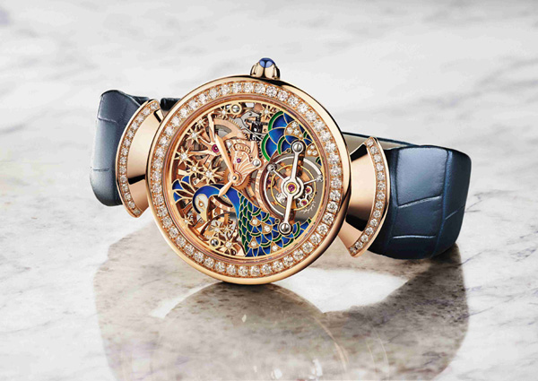 第二款腕表呈現出傲然明亮的白晝景象,精致典雅。光彩奪目的孔雀在以珍珠母貝打造的白日背景的映襯下,與表盤上鉆石鑲嵌晶瑩閃亮的星星交相輝映。直徑為37毫米的玫瑰金表殼同樣搭配藍色鱷魚皮表帶。這兩款精致而珍稀的腕表,每款鑲嵌了多達135顆鉆石,充分彰顯了寶格麗卓越的珠寶制造工藝。同時,兩款腕表均搭載寶格麗自制自動上鏈機械機芯。