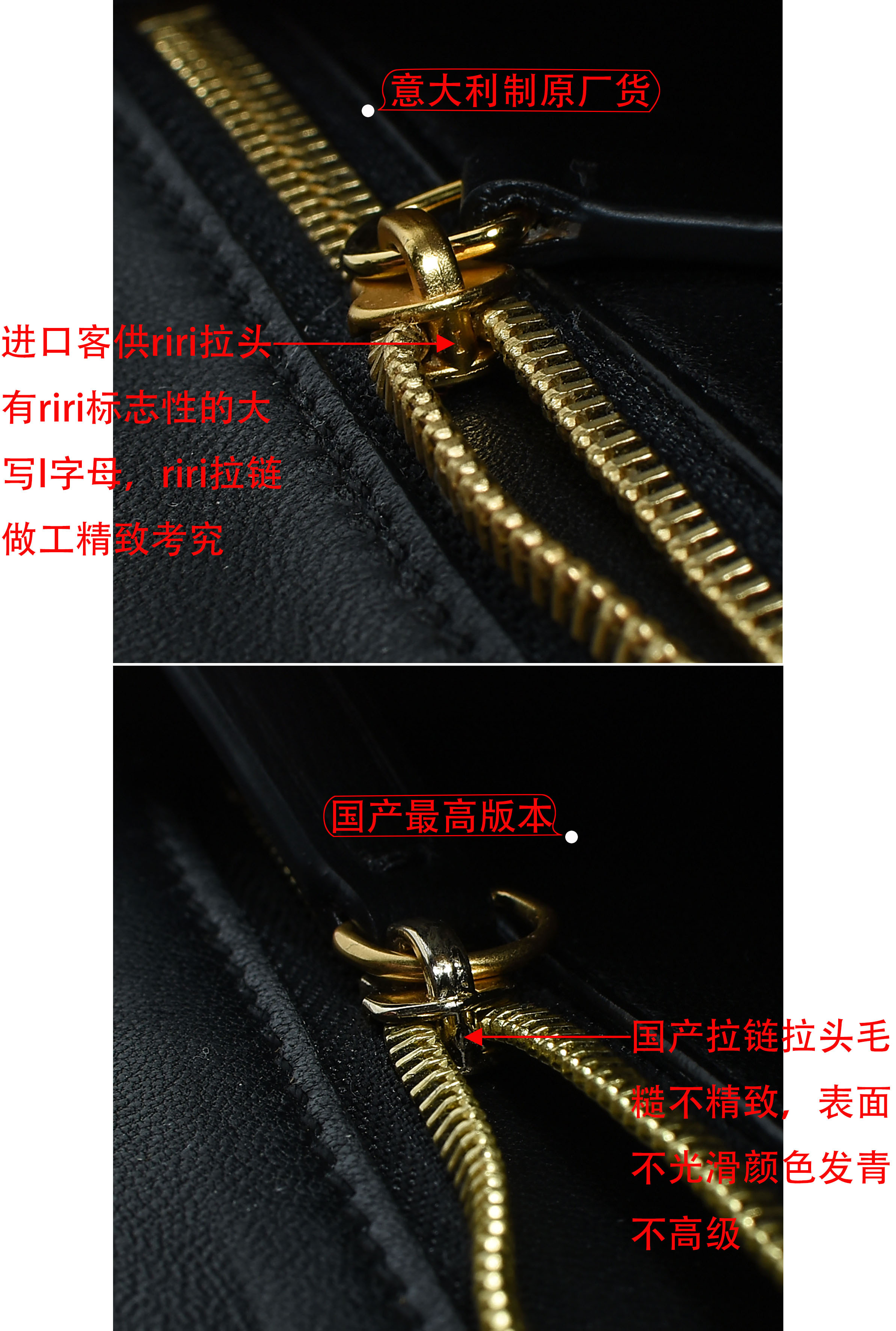 正品采用的是最好的拉鏈供應商之一的riri拉鏈,其陳色,工藝精致度都比ykk高幾個級別,也是奢侈品常用的拉鏈,這些隱藏的細節在分辨真假時最容易被忽略。