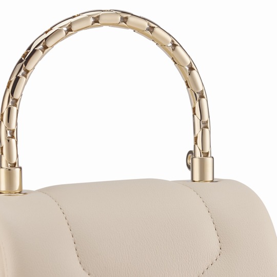Serpentine 迷你托特包采用白瑪瑙色水晶閃光麂皮材質手工精制而成,表面裝飾不同尺寸的漸變金色璀璨水晶,將挺括的豎款造型與珠寶元素細節巧妙結合,令人不禁聯想到靈蛇的曼妙靈動之姿。