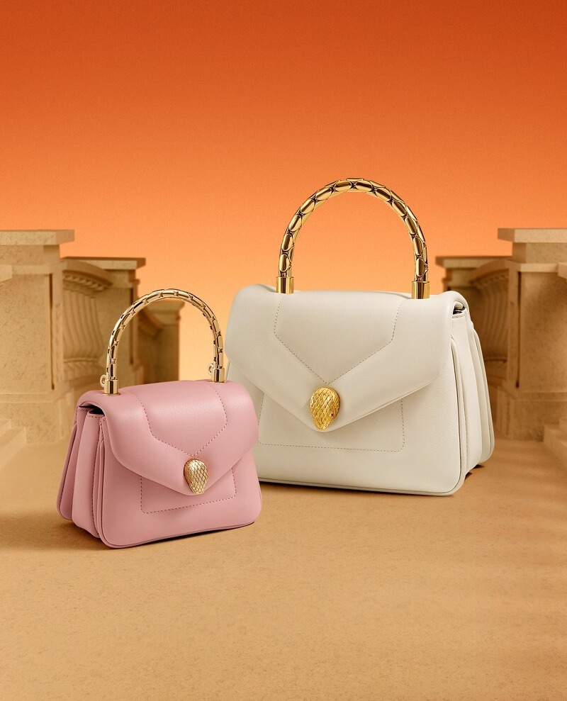 Bvlgari 剛剛上市2023秋季包袋,Serpenti Forever 系列取材天然水蛇皮和麂皮材質,通體飾以璀璨水晶、金色鉚釘裝飾,綻放珠寶般的耀眼光芒;Serpenti Reverse 手拎包以蓬軟包型搭配粉色和象牙白色調,為七夕情人節注入甜蜜溫馨氛圍。